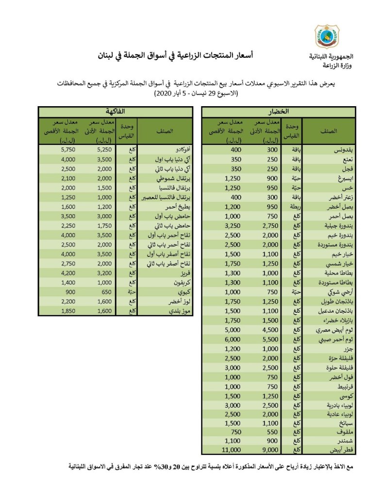 April 29, 2020 Chef Michel أسعار المنتجات الزراعية لهذا الاسبوع Share this:Tweet Click to print (Opens in new window) Print Click to share on Telegram (Opens in new window) Telegram Click to share on WhatsApp (Opens in new window) WhatsApp Click to email a link to a friend (Opens in new window) Email Like Loading... Related